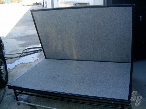 FEATURES: UNITS ARE IN GOOD SHAPE. USED IN A MAJOR HOTEL CHAIN BALLROOM. ALL UNITS ARE ON WHEELS WITH ALL HARDWARE ATTACHED. INDUSTRIAL CARPETED ON TOP, VELCRO SKIRT ATTACHMENTS ON ALL SIDES. THERE ARE 5 DUSTY GREY UNITS AND ONE DUSTY ROSE UNIT.