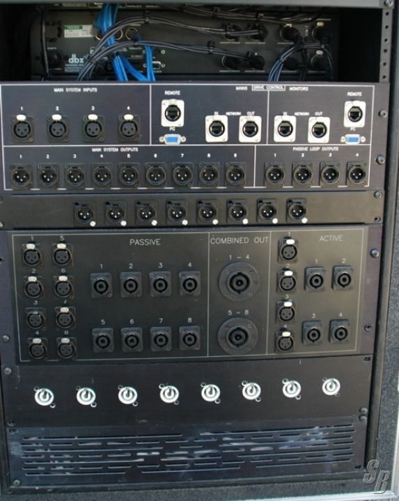 MODIFICATIONS: BACK OF AMP RACK HAS A CUSTOM PANEL FOR QUICK HOOK UP TO MONITOR WEDGES VIA SPEAKON AND MAIN SYSTEM OUTPUTS (FOR ACTIVE SPEAKERS)VIA XLR CONNECTORS. THE MONITORS CAN BE QUICKLY CONFIGURED FOR PASSIVE OR BIAMPED MODE. IN PASSIVE, THE AMP RACK CAN POWER 8 MIXES, IN BI-AMPED 4 MIXES. DSP FOR THE MONITORS IS DONE W/ THE 442 DRIVERACKS. THERE ARE ALSO 8 POWERCON OUTS FOR CONVENIENCE. POWER TO THE RACK IS SUPPLIED BY A L14/30 CONNECTOR.