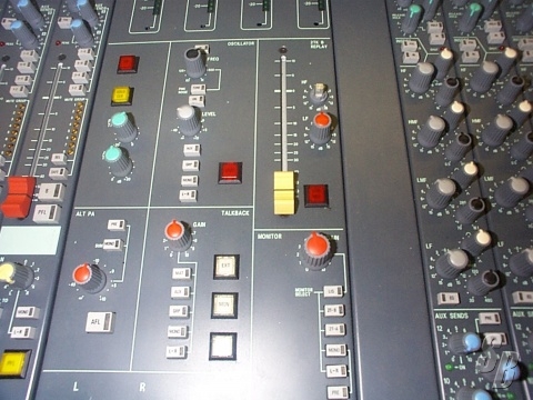 THERE ARE "PFL TRIM" AND "AFL TRIM" POTS (SEAFOAM) AND A MASTER RED BULB-LIT "CUT" BUTTON AND A MASTER YELLOW BULB-LIT "SOLO CLR" BUTTON. THERE IS AN ONBOARD OSCILLATOR, WITH A "FREQUENCY" POT (BLACK) AND A "LEVEL" POT (GRAY). THERE ARE ALSO A NUMBER OF ASSIGNMENT BUTTONS FOR ROUTING THE OSCILLATOR TO DIFFERENT OUTPUTS. THERE IS A 2-TRK REPLAY A/B (STEREO XLR/ 1/4") SECTION WITH A FADER (YELLOW) AND TWO EQ POTS "HF" AND "LF" (RED). THERE IS ALSO A RED BULB-LIT "CUT" BUTTON. ALT PA CORRESPONDS TO A SEPARATE SET OF XLR SENDS ON THE BACK OF THE CONSOLE. THERE ARE "PRE", "MONO" AND "AFL" SELECTOR SWITCHES IN THE ALT PA SECTION. THERE IS ALSO A TALKBACK SECTION WITH A "GAIN" POT AND ROUTING ASSIGNMENT SWITCHES.