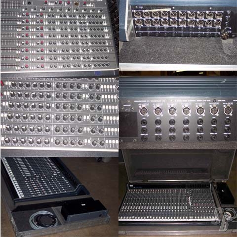 SOUNDTRACS MX24 24 INPUT CHANNELS EACH WITH SWITCHABLE PHANTOM POWER, -20DB PAD, MIC/LINE AND PHASE SWITCH. 4 BAND EQ WITH 2 SWEPT MIDS, 6 AUX WITH PRE/POST OPTION, GROUP ROUTING, ILLUMINATED MUTE AND SOLO SWITCHES, PEAK LED AND 100MM FADERS. 8 GROUPS AND LED METERS FOR L - R, SOLO, GROUPS AND AUX. INCLUDES MX24 POWER SUPPLY AND R&R CASE ON WHEELS. MISSING A COUPLE KNOBS, HAD MAJOR MAINENANCE IN JULY 2000. MANUFACTURED 1990.