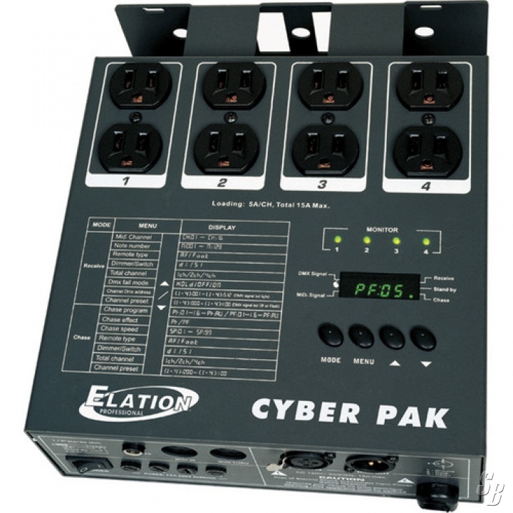 THE ELATION CYBER PAK IS YOUR 3-IN-1 PACK, THAT FUNCTIONS AS A CHASE CONTROLLER, DIMMER PACK OR MIDI PACK. THE 4-CHANNEL CHASE CONTROLLER HAS 10 BUILT-IN PROGRAMS, WHICH CAN ALSO BE SET TO FADE-IN AND FADE-OUT. THE DIMMER PACK FEATURES 4 INDIVIDUAL DMX CHANNELS THAT CAN BE SET TO 1, 2 OR 4 CHANNELS. THE MIDI MODE CAN RECEIVE NOTES 001-128 THOUGHT ITS MIDI IN AND MIDI THROUGH CONNECTIONS. THE DIGITAL DISPLAY ALLOWS YOU TO SEE THE CURRENT PROGRAM BEING USED.