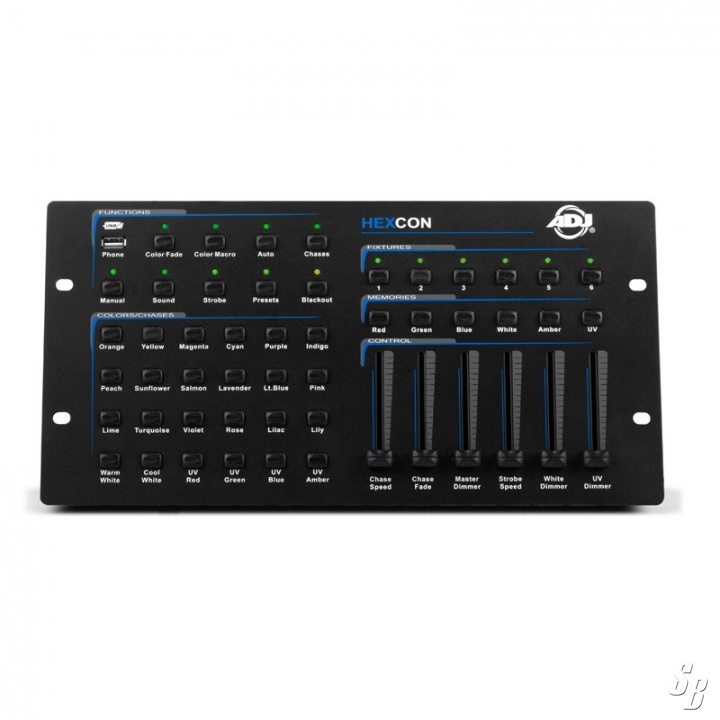 THE HEXCON IS A 36-CHANNEL DMX CONTROLLER THAT WAS SPECIFICALLY DESIGNED FOR OUR 滴EX SERIES PRODUCTS. UP TO 6, RGBAW+UV, LED FIXTURES OR FIXTURE GROUPS CAN INDEPENDENTLY BE CONTROLLED VIA SIX FIXTURE BUTTONS. ALL ADJ HEX SERIES FIXTURES OR FIXTURE GROUPS MUST BE SET TO RUN IN DMX MODE AND BE ADDRESSED AT CHANNELS 1, 7, 13, 19, 25 AND 31 TO ACCESS INDEPENDENT FIXTURE CONTROL. THE HEXCON CONTROL PANEL INCLUDES 24 DIRECT ACCESS PRE-PROGRAMMED COLOR MACRO BUTTONS, 6 USER PROGRAMMABLE COLOR PRESET BUTTONS WHICH COME FACTORY SET TO CONTROL RED, GREEN, BLUE WHITE, AMBER AND UV, 6 MULTI-FUNCTION CHANNEL FADERS WHICH ARE USED TO CONTROL INDIVIDUAL COLOR INTENSITY, CHASE PROGRAM 鉄PEED? CHASE PROGRAM 擢ADE? MASTER DIMMER AND STROBE SPEED. THERE IS AN ARRAY OF 8 擢UNCTION BUTTONS WHICH ARE USED TO SELECT THE CONTROLLERS OPERATION MODE, INCLUDING COLOR FADE, COLOR MACRO, AUTO, CHASES, MANUAL, SOUND, STROBE, PRESETS AND BLACKOUT MODES. A USB PORT IS ALSO CONVENIENTLY INCLUDED SO MOST PHONES OR TABLETS CAN BE CONNECTED AND CHARGED. THE HEXCON IS ONE OF THE SIMPLEST AND MOST VERSATILE LED CONTROLLERS AVAILABLE TODAY. IT担 IDEAL FOR D.J.担, NIGHTCLUBS, LOUNGES, BARS OR FOR ANYONE THAT WANTS TO GET THE MOST OUT OF THEIR HEX SERIES LED PRODUCTS.