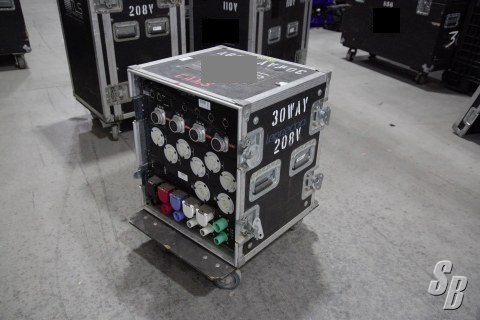 30WAY - 110V 20AMP CIR. 4- SOCO OUT MOTION LABS DISTRO WITH ADDITIONAL 6- L6-20 BALANCING CONNECTORS. INCLUDES 2-CIR L21-30 MOTOR POWER, FEED AND USE METER PANELS, MAINS BREAKER, PASS-THROUGH CAM LOC AND LITTLE LIGHT.