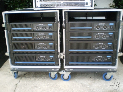 2 AMP RACK WITH 7500 WATTS EACH IN ATA ROLLING RACK WITH WHEEL LOCKS EACH RACK CONTAINS 2 CARVIN DCM 2500 WATT,1 CARVIN DCM 1500 WATT, 1 CARVIN DCM 1000 WATT