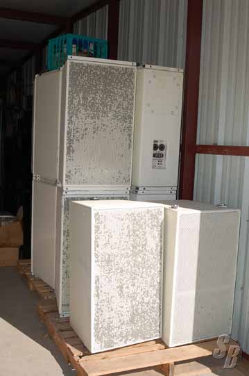 EAW KF 600IXP. PAINTED WHITE. ATM FLYWARE ATTACHED WITH PARTS. ALL ORIGINAL, USED WITH CARE, FLOWN, IN A CLIMATE CONTROLLED MUSEUM CORPORATE EVENT CENTER. NEVER TOURED. WHITE BOXES, NO HANDLES, APPROX 14 YEARS OLD. PAINT IS SLUFFING OFF GRILLS (SEEN IN PICTURES) BUT ONLY MINOR DENTS & SCRAPES DONE WHILE REMOVING. FLYWARE WAS CONFIGURED FOR 4 -3 BOX ARRAYS WITH 2 SINGLE DOWNFIRE BOXES.