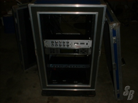 FEATURES: THIS IS A 20 SPACE SHOCK MOUNT ROAD CASE THAT HAS BEEN USED FOR ABOUT 1 YEAR WORTH OF SHOWS. IT IS A VERY HEAVY DUTY CASE WITH ROLLING CASTERS TO MOVE THE CASE WITH EASE. ALL THE EQUIPMENT SHOWN IS NOT INCLUDED BUT I WILL BE LISTING THE ITEMS TO SELL. IF INTERESTED JUST EMAIL ME. THIS CASE HAS 1/2 INCH PLYWOOD WALLS AND TOPS WITH BLUE LAMINATE OVER THE PLYWOOD. IT HAS REINFORCED CORNERS AND RECESSED HANDLES. IT HAS 2 RECESSED BUTTERFLY LATCHES ON EACH SIDE OF THE COVERS FOR A TOTAL OF 4 PER COVER. IT DOES HAVE THE USUAL SCRATCH HERE AND THERE BUT NOTHING THAT BREAKS THROUGH ANY OF THE LAMINATE.