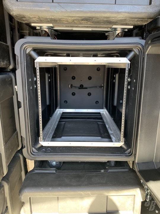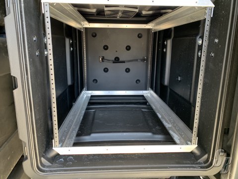 THE INNER RACK CHASSIS IS BUILT OF HIGH STRENGTH / LIGHTWEIGHT ALUMINUM ALLOY AND 11 GAUGE HOT ROLLED CARBON STEEL RACK RAILS TO DIA-310 STANDARDS. SHOCK AND VIBRATION MITIGATION IS ACCOMPLISHED WITH EIGHT (8) ELASTOMERIC ISOLATORS RATED FOR A PAYLOAD RANGE OF 40 LBS. TO 150 LBS. IN A STANDARD CONFIGURATION AND UP TO 300 POUNDS IN A SPECIAL ORDER EXTENDED PAYLOAD CONFIGURATION ALLOWING ADEQUATE SWAY SPACE FOR AMBIENT AIR CIRCULATION AND HEAT DISSIPATION. THE RACK RAILS COME PRE-THREADED FOR STANDARD 10-32 HARDWARE AND MOUNTING SCREWS ARE INCLUDED.
