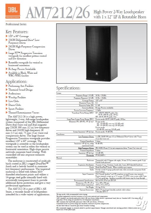 THE AM7212/64 IS A HIGH POWER, LIGHTWEIGHT, 2-WAY, FULL-RANGE LOUDSPEAKER SYSTEM COMPRISED OF THE JBL DIFFERENTIAL DRIVE DUAL VOICE COIL AND DUAL MAGNETIC GAP 2262H 300 MM (12 IN) LOW FREQUENCY DRIVER AND 2432H HIGH-FREQUENCY 38MM (1.5 IN) EXIT, 75 MM (3 IN) VOICE-COIL COMPRESSION DRIVER.