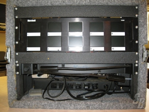 FEATURES: THE V-R82P IS A RACK MOUNTED UNIT THAT HAS TWO INDEPENDENTLY CONTROLLED 7.9" ACTIVE MATRIX LCD PANELS WITH LOOPTHROUGH CAPABILITY. IT IS MOUNTED IN A 19" RACK COMPLETE WITH POWER STRIP AND RACK LIGHTS. EACH OF THE TWO SCREENS IS NTSC/PAL AUTO-DETECT AND HAS INDIVIDUAL FRONT MOUNTED SELECTOR BUTTONS WITH COLOR, TINT, BRIGHTNESS AND CONTRAST CONTROLS ACCESSIBLE VIA AN ON-SCREEN DISPLAY MENU. POWER SUPPLY IS INCLUDED.