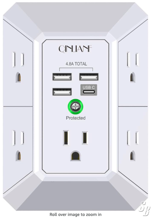 WALL CHARGER, SURGE PROTECTOR, QINLIANF 5 OUTLET EXTENDER WITH 4 USB CHARGING PORTS (4.8A TOTAL) 3-SIDED 1680J POWER STRIP MULTI PLUG ADAPTER SPACED FOR HOME TRAVEL OFFICE (3U1C)