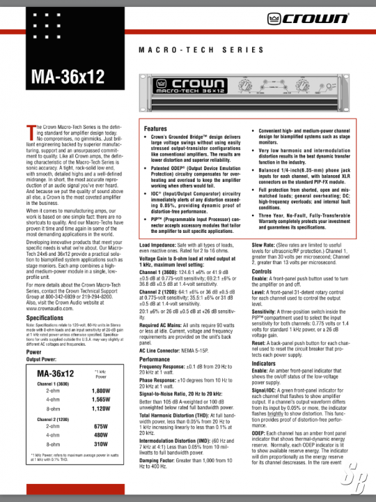 FEATURES: CROWN MACRO TECH 36 X 12 AMPLIFIER