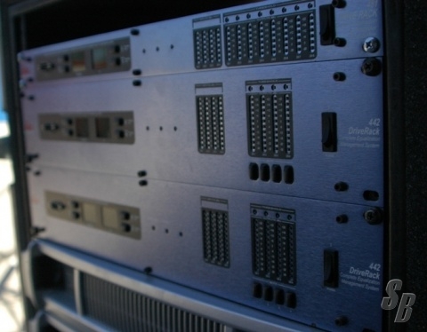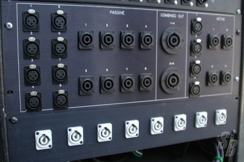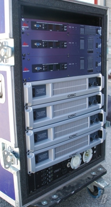 MODIFICATIONS: BACK OF AMP RACK HAS A CUSTOM PANEL FOR QUICK HOOK UP TO MONITOR WEDGES VIA SPEAKON AND MAIN SYSTEM OUTPUTS (FOR ACTIVE SPEAKERS)VIA XLR CONNECTORS. THE MONITORS CAN BE QUICKLY CONFIGURED FOR PASSIVE OR BIAMPED MODE. IN PASSIVE, THE AMP RACK CAN POWER 8 MIXES, IN BI-AMPED 4 MIXES. DSP FOR THE MONITORS IS DONE W/ THE 442 DRIVERACKS. THERE ARE ALSO 8 POWERCON OUTS FOR CONVENIENCE. POWER TO THE RACK IS SUPPLIED BY A L14/30 CONNECTOR.