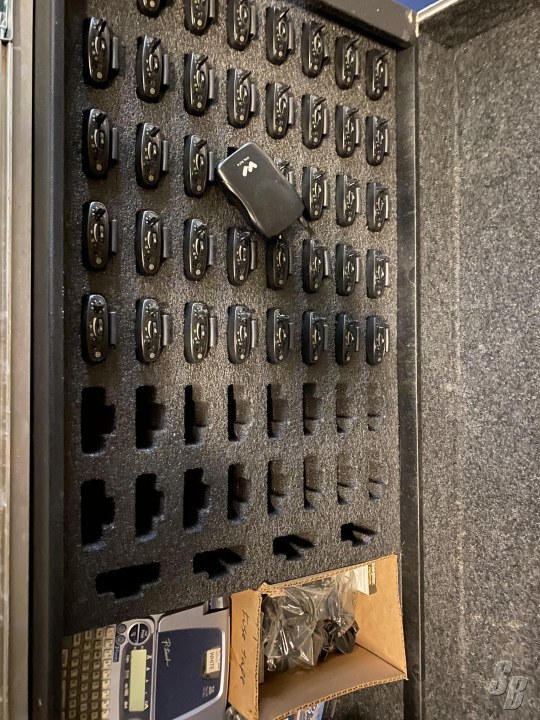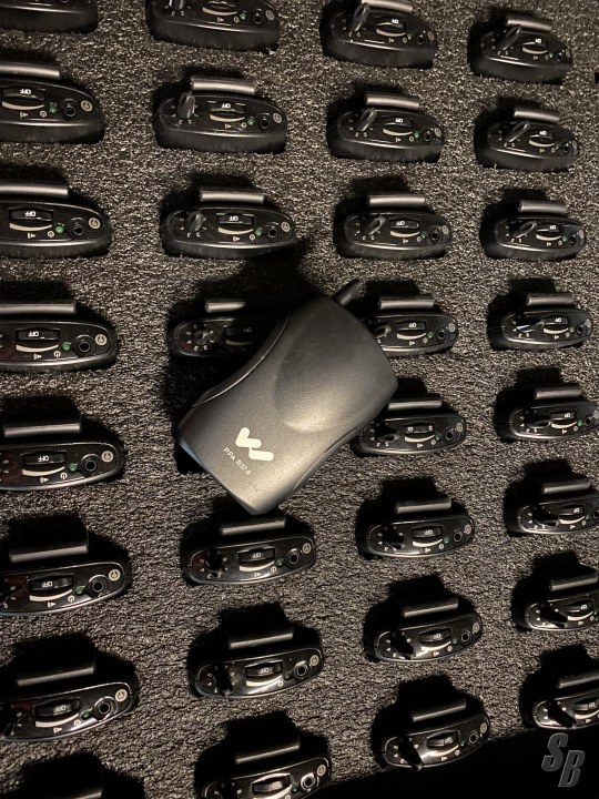 (2) SETS OF (8) FM TRANSMITTERS AND (100) RECEIVERS IN CUSTOM CASES WITH ALL HED27 LIGHTWEIGHT HEADSETS AND OVER THE EAR CLIP ON