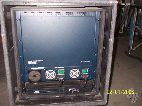 THE STAGE RACK IS CONFIGURED 48X24 (6 SRI AND 3 SRO CARDS) AND HAS A 1KW TRIPPLITE UPS IN 12 SPACE BLACKHURST SHOCK RACK.