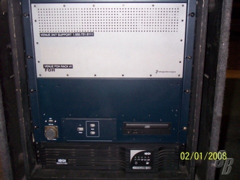 THE FOH RACK HAS 3 DSP, PRO V2.0 PLUG-INS, ECX (ETHERNET) CARD, FWX (PROTOOLS LE) CARD, 2ND SNAKE CARD AND 1.5KW TRIPPLITE UPS IN 12 SPACE BLACKHURST SHOCK RACK.