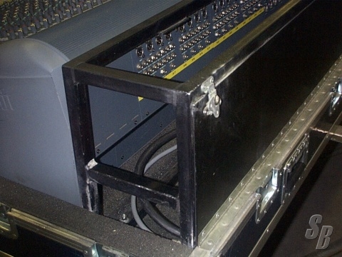 CUSTOM ROADCASE WITH METAL DOGHOUSE - REMOVABLE PANELS ROADCASE HAS A REMOVABLE SECTION FOR ACCESSING DOGHOUSE WITHOUT UNCAPPING ENTIRE DESK 2 CPS1000 POWER SUPPLIES IN A SEPARATE CUSTOM ROLLING ROADCASE