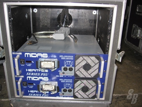 MIDAS (HERITAGE 3000) H/3/40/8/TP 48 FRAME (40 MONO + 8 STEREO INPUT MODULES, 24 AUX/GROUP, 10 VCA'S, 8 MATRIX, SPATIAL IMAGING SYSTEM LCR PLUS IMAGE CONTROL & SNAPSHOT AUTOMATION) MIXING CONSOLE WITH TWO H750 POWER SUPPLIES (1 IS SPARE), LITTLITES, DUST COVER, AND TOURING FLIGHT CASE,
