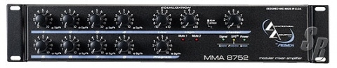 ARCHITECTURAL ACOUSTICS MMA 8752 MODULAR MIXER AMPLIFIER, NINE CHANNEL MIXER/POWER AMPLIFIER SYSTEM; EIGHT INPUT PORTS ACCEPT MMA PLUG-IN MODULES DEDICATED PROGRAM INPUT; SWITCHABLE LOW CUT FILTER; EXTERNAL VOLUME CONTROL CAPABILITY; TWO MUTE BUSES; PREAMP OUTPUT/POWER AMP INPUT PATCH CAPABILITY; SHORT CIRCUIT AND THERMAL PROTECTION; SPS (SPEAKER PROTECTION SYSTEM) CIRCUITRY WITH INDICATOR; 75 WATTS RMS, 4 OHM DIRECT OUTPUT; 8 OHM/25 VOLT, 70 VOLT, AND 100 VOLT TRANSFORMER ISOLATED POWER OUTPUTS CE APPROVED. BRAND NEW WITH FULL FACTORY WARRANTY, FOB, MS USA.