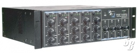 ARCHITECTURAL ACOUSTICS PZS 140RA. FIVE INPUT CHANNELS, ASSIGNABLE TO ANY OUTPUT MIC AND LINE-LEVEL INPUTS FOR EACH CHANNEL, RCA STEREO SUMMING INPUTS (CHANNELS 3, 4 AND 5); FOUR BALANCED (600 OHM) LINE-LEVEL OUTPUTS, FOUR 35 WATT POWER AMPLIFIERS WITH 70V, 25V, 8 OHM AND 4 OHM OUTPUTS; REMOVABLE EURO CONNECTORS FOR ALL I/O; SUPPORT FOR THE D-SERIES D4S REMOTE CONTROL PANEL SIGNAL LED INDICATOR ON EACH INPUT CHANNEL ZONE ASSIGNMENT SWITCHES FOR EASY ROUTING ADJUSTABLE THRESHOLD AND PAGING HOLD (CH 1/2) FOUR MASTER OUTPUT LEVEL CON-TROLS SIGNAL AND CLIPPING LEDS ON ALL OUTPUTS 48 VOLT PHANTOM POWER ON ALL MICROPHONE INPUTS SHELF, OR RACK-MOUNTABLE, FAN-COOLED PACKAGE RACK KIT INCLUDED. CE APPROVED.