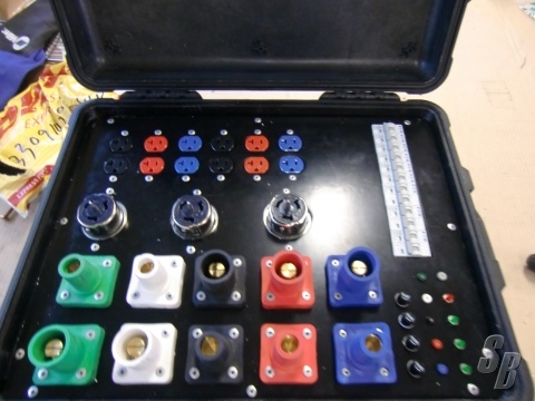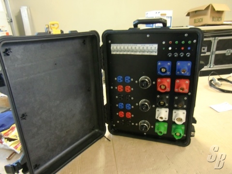 FEATURES: POWER DISTRO MOUNTED IN A 1560 PELACIAN CASE. 400 AMP 3P5W CAM IN/THREW. 3X50 AMP 2P 120/240 TWIST LOCK (CAL STYLE)AND 6 X 20 AMP EDSION. TEST JACKS AND LED DUMMY LIGHTS