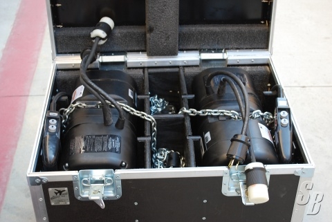 FEATURES: CM LOADSTAR 1/2 TON CHAIN MOTORS ( F 1P W/HK)IN ROAD CASE. THESE MOTORS WERE OREDERED AS SINGLE PHASE FOR EASE OF USE WITH OUT THE NEED FOR A DISTRO.