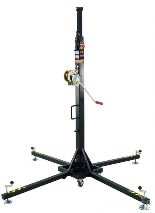 THE TE-064 IS A TELESCOPIC TOWERLIFT FOR HEAVY LOADS, DESIGNED FOR PROFESSIONAL USE AND FOR ANY SHOW WHERE STRENGTH, SECURITY AND EASE OF USE ARE REQUIRED. THE FOUR SECTIONS OF THE TE-064 ARE OPERATED WITH A STEEL CABLE THROUGH A MANUAL WINCH WITH A DISC BRAKE. THE SECTIONS REMAIN AUTOMATICALLY FIXED TO THE REQUIRED HEIGHT BY THE LOCKS OF THE EXCLUSIVE ALS AUTO LOCK SECURITY SYSTEM. THE ALS SYSTEM FIXES THE SECTIONS TO THE REQUIRED HEIGHT, BLOCKING THE TOWERLIFT AND MAKING IT IMPOSSIBLE FOR THE LOAD TO FALL. IT GUARANTEES COMPLETE WORKING SECURITY ON STAGE. IT HAS FOUR STABILIZING LEGS THAT CAN BE REMOVED AND COME WITH ADJUSTABLE DISC FEET, SWIVEL WHEELS AND A SPIRIT LEVEL THAT HELPS TO MAINTAIN THE VERTICAL POSITION OF THE TOWERLIFT. WITH THE TOWERLIFT FOLDED AND THE LEGS BACK IN THEIR COMPARTMENTS, IT FORMS A COMPACT BLOCK WHICH MAKES IT EASY TO MANEUVER AROUND THANKS TO THE SWIVEL WHEELS OF THE BASE.