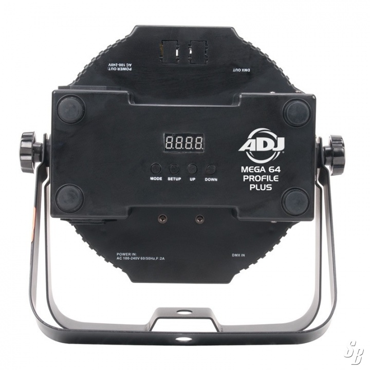 THE ADJ MEGA 64 PROFILE PLUS IS A COMPACT, LOW PROFILE WASH FIXTURE DESIGNED FOR UPLIGHTING, STAGE LIGHTING AND WALL WASHING, AND WILL BRING COLOR AND EXCITEMENT TO ANY PARTY. THE MEGA 64 PROFILE PLUS IS POWERED BY TWELVE BRIGHT 4-WATT QUAD (RGB+UV 4-IN-1) LED. THIS PAR IS INTELLIGENTLY DESIGNED SO THAT IT MAY SIT DIRECTLY ON THE GROUND OR INSIDE TRUSS WITHOUT THE HANGING BRACKET BECAUSE THE POWER & DMX INS AND OUTS SIT ON THE SIDE OF THE FIXTURE, NOT ON THE REAR.