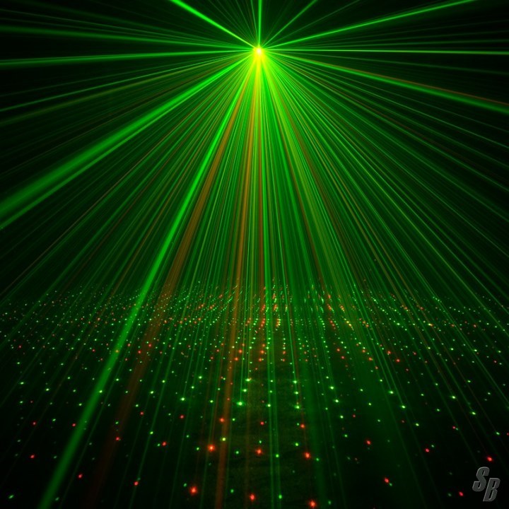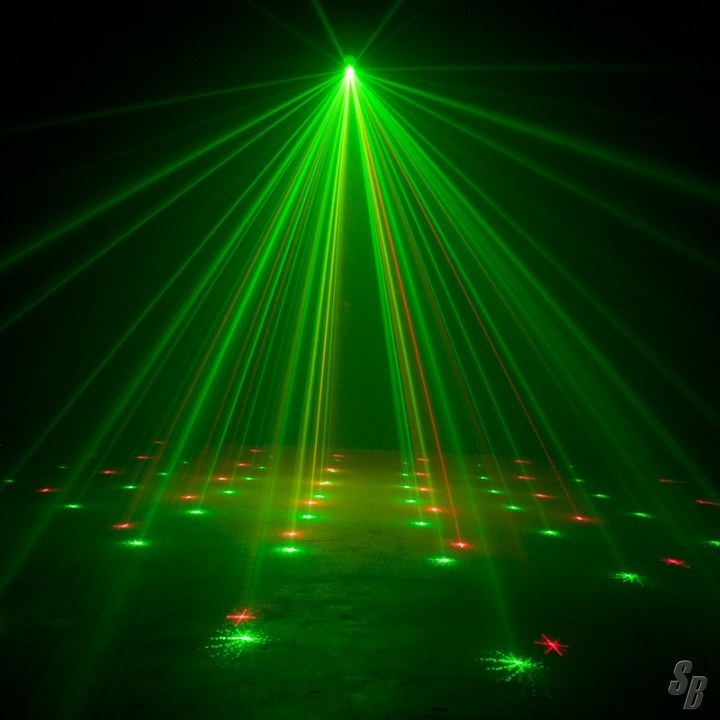 THIS GREEN AND RED LASER PRODUCES MORE THAN 200 BEAMS THAT MAY BE PROJECTED ON A WALL, CEILING OR DANCE FLOOR.