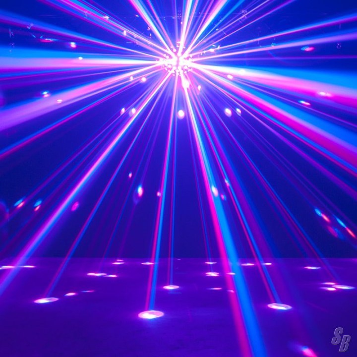 THE STARBURST IS A ROTATING “FUTURISTIC MIRRORBALL” FIXTURE THAT SENDS OUT INCREDIBLY CONCISE BEAMS OF COLORED LIGHTING THAT CREATE A MOVING ARRAY OF SUPER-EFFECTIVE ‘STARS’ WHEN PROJECTED ONTO WALLS, CEILINGS AND FLOORS. THIS ‘NIGHT-SKY’ EFFECT IS ENHANCED BY THE UNIT’S POWERFUL 50W SOURCE, WHICH CONSISTS OF FIVE 15W SIX-COLOR (RGBAW+ PURPLE) LEDS AND GENERATES HIGHLY POWERFUL BEAMS OF LIGHT IN A WIDE PALLET OF COLORS. FURTHERMORE, THE STARBURST’S TIGHT BEAM ANGLE HELPS THE SHAFTS OF LIGHT CUT THROUGH DARKNESS AND FOG TO OFFER A FUTURISTIC, FAR-REACHING EFFECT THAT WILL TRANSFORM ANY SMALL-MEDIUM SIZED VENUE.