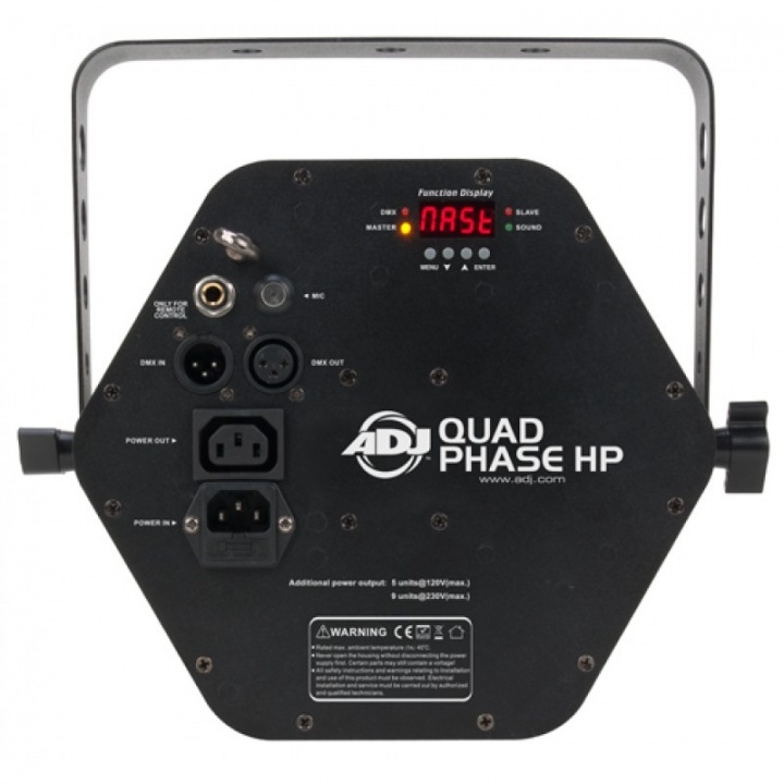 THE QUAD PHASE HP ALSO OFFERS ALL THE LATEST FEATURES SOUGHT AFTER IN SPECIAL EFFECTS LIGHTS SUCH AS: DMX-512 FOR PROGRAMMING OR LINKING CAPABILITIES, EXCITING BUILT-IN SOUND ACTIVE PROGRAMS, NO DUTY CYCLE (RUN ALL NIGHT), A LONG LIFE LED SOURCE (30,000 HOURS), 4-BUTTON DMX DISPLAY ON REAR (FOR EASIER PROGRAMMABILITY), IEC POWER DAISY-CHAINING, A 1.8 STEEPER MOTOR FOR SMOOTH MOVEMENT AND IS COMPATIBLE WITH ADJ'S UC3 EASY-TO-USE MINI CONTROLLER. INCLUDES A WIRELESS IR REMOTE (ADJ RC1). USE THE QUAD PHASE HP AT YOUR NEXT GIG AND SHOW OFF YOUR SUPERIORITY.