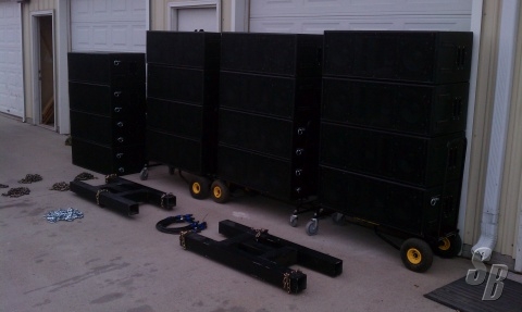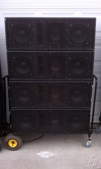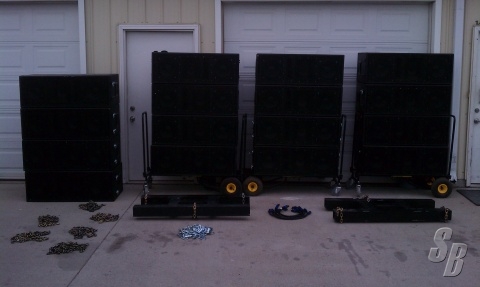 FEATURES: 16 BOX LINE ARRAY SYSTEM FOR SALE. PROFESSIONALLY CONSTRUCTED BY MIDIAN MEDIA GROUP (WWW.MIDIANMEDIA.COM). ALL B & C DRIVERS. EACH BOX CONSISTS OF 2X10", 1X8", AND 2X1" HORN DRIVERS. DIMENSIONS ARE 40" WIDE, 14" TALL, 20" DEEP. STEEL FLY BARS, CHAINS, FLY HARDWARE INCLUDED. BOXES ARE PASSIVE 2-WAY (MID/HIGH). LOWS: 600 WATTS @4 OHMS (PINS 1+/-). MID/HIGHS: 300 WATTS @ 4 OHMS (PINS 2+/-). 8 BOXES HAVE 2 NL4 CONNECTORS, 8 BOXES HAVE 1 NL4 CONNECTOR. FLOWN IN PAIRS. NL4 JUMPER SPEAKER CABLES INCLUDED. DOLLY CARTS INCLUDED. ROUGHLY 70 LBS EACH. IF YOU ARE LOOKING FOR SUPERIOR SOUND FROM AN ARRAYABLE SOURCE, THIS IS AN EXCELLENT OPTION. GUARANTEED NOT DOA. SERVICED, PROFESSIONALLY MAINTAINED, KILLER.