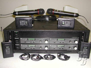 2 SONY WRR840 DUAL RECEIVERS WITH 4 - WRT820A BODY PACKS WITH LAV MICS AND 2 - WRT810A HANDHELD TRANSMITTERS. INCLUDES 2 - AN820A ANTENNA AND