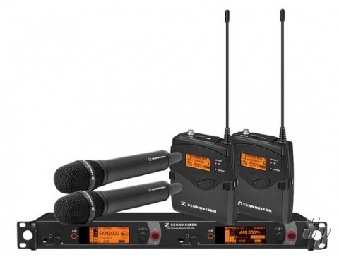 SENNHEISER 2000C2-945 BK DUAL CHANNEL CONTRACTOR SYSTEMS - (2) SK 2000XP BODYPACKS, (2) SKM 2000XP HANDHELDS WITH MM D 945-1 CAPSULES, BLACK (1) EM 2050 DUAL CHANNEL RECEIVER. FREQUENCY RANGE AW (515 /558 MHZ), FREQUENCY RANGE BW (626 / 698 MHZ), AND FREQUENCY RANGE GW (558/626 MHZ).