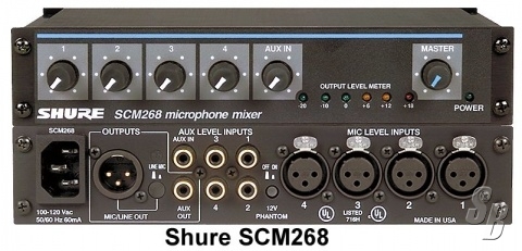 SHURE MODEL SCM268, FOUR-CHANNEL TRANSFORMER BALANCED MICROPHONE MIXER AND PHANTOM POWER, AC ONLY, HALF RACK SPACE, SINGLE AND DUAL MOUNT.