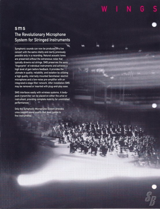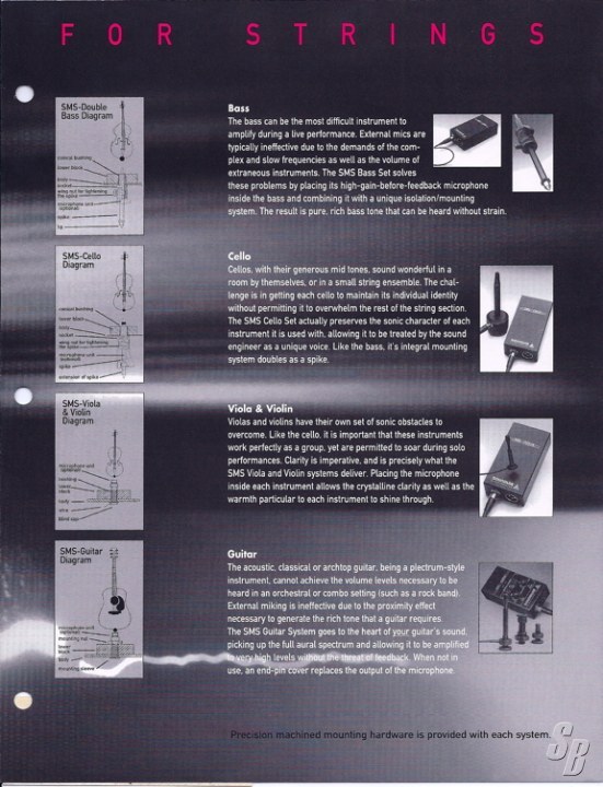 IT'S A UNIQUE SYMPHONIC STRING MIKING SYSTEM. UTILIZE THE END PIN OF THE INSTRUMENTS TO INSERT A SENNHEISER MKE-3 MICROPHONE INSIDE THE INSTRUMENT TO THE SWEET SPOT. THE USER REPLACES THE ENDPIN WITH THE ONE PROVIDED BY THE SYSTEM. THE MIC CAN BE USED WITH THE SUPPLIED POWER/EQ SUPPLY OR CAN BE CONNECTED TO A SHURE WIRELESS BELT PACK.