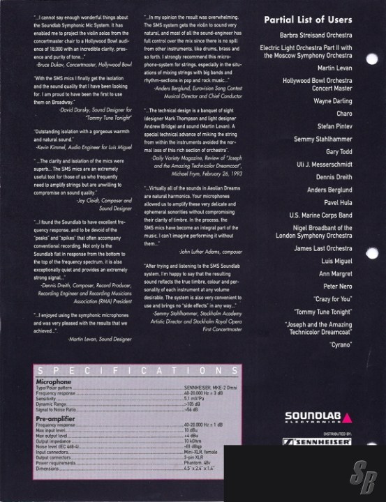THIS SYSTEM HAS BEEN USED BY NAMM, THE GRAMMYS, BARBRA STREISAND'S ORCHESTRA, ELECTRIC LIGHT ORCHESTRA WITH THE MOSCOW SYMPHONY ORCHESTRA, MARTIN LEVAN, BROADWAY SOUND DESIGNER FOR ANDREW LLOYD WEBBER, HOLLYWOOD BOWL ORCHESTRA CONCERT MASTER, AND OTHERS.
