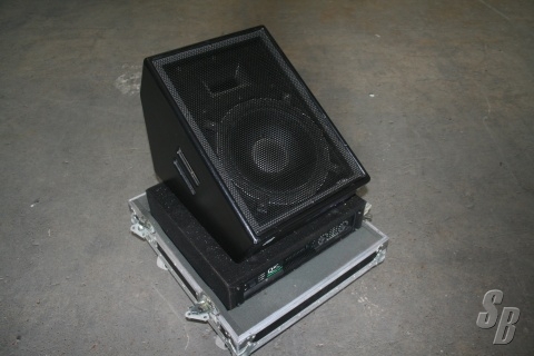 1 CUE WEDGE, OAP 1202 BI-AMPED STAGE MONITOR COMES COMPLETE WITH QSC PL1.6 AMPLIFER IN A ROAD CASE.
