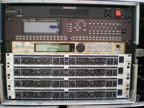 1 - 8 RU ATA CASE WITH 5 STEREO COMPRESSOR LIMITERS AND 1 ALESIS MIDI VERB 4, POWER DISTRIBUTION IN TOP OF RACK