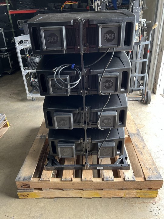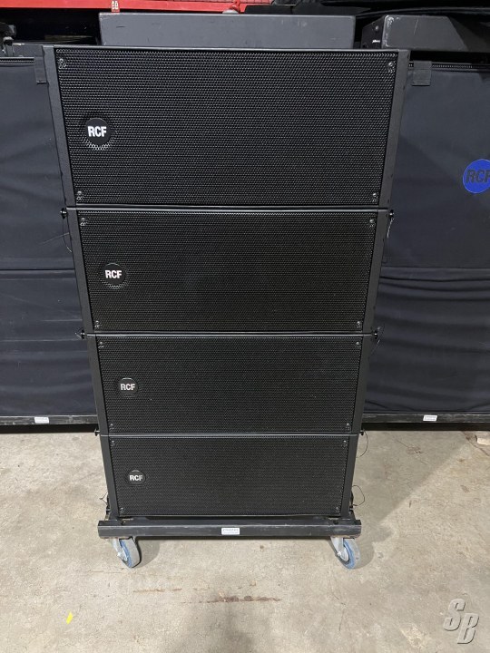 4 USED RCF POWERED HDL20 WITH RAIN COVERS ON ALL BOXES. 1 CART THAT HOLDS THE 4 SPEAKERS. 1 COVER THAT COVERS THE 4 RCF HDL20. 2 FLY BARS RCF FL-B LGT HDL20 SUSPENDING FLY BAR FOR HDL 20-A LINE ARRAY (UP TO 4 SPEAKERS)