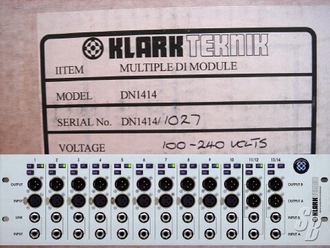 THE KLARK TEKNIK DN1414 IS AN EXTREMELY HIGH PERFORMANCE, 14-CHANNEL DI MODULE HOUSED IN A 3U, RACK MOUNTING CASE WITH AN INTEGRAL SWITCH MODE POWER SUPPLY THAT AUTOMATICALLY ADAPTS TO MAINS VOLTAGES IN THE RANGE 100 TO 240 VOLTS (50 TO 60HZ).ADUAL PSU IS AVAILABLE AS A FACTORY FITTED OPTION. APPLICATIONS INCLUDE PROVIDING DI BOX FEEDS TO SERVICE MONITOR AND FOH CONSOLES AS WELL AS TO FACILITATE THE MULTITRACK RECORDING OF LIVE EVENTS.