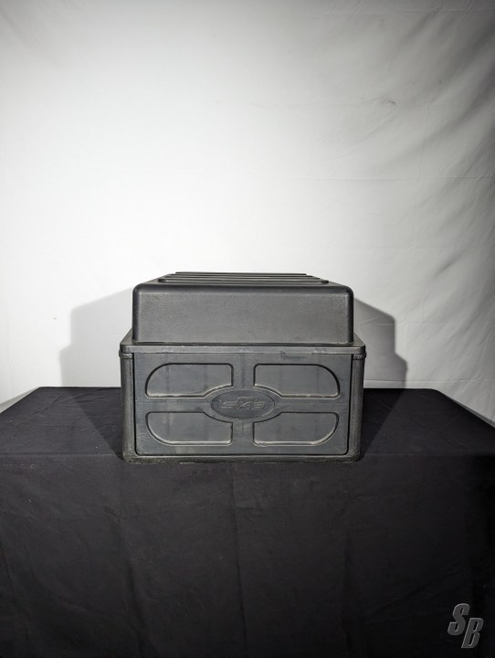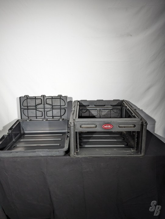 BLACK, PLASTIC AUDIO MIXER CASE WITH DETACHABLE LID.