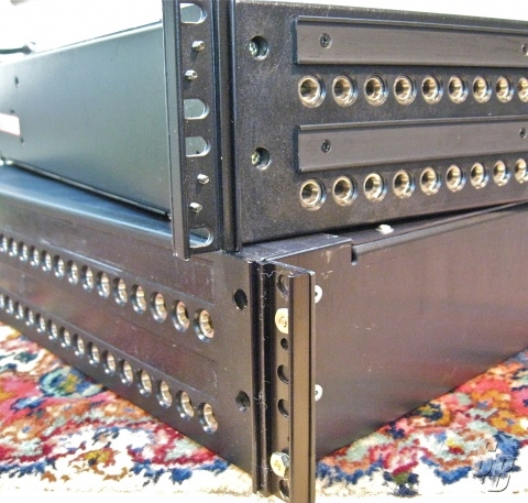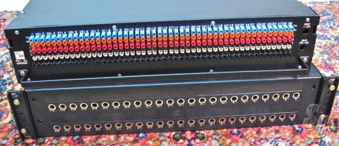 THE PANELS ARE 2 RACK UNITS HIGH, WITH A TOTAL OF 48 JACKS IN 2 ROWS OF 24. THE PUNCH PANELS ARE ON THE REAR OF AN 18 INCH DEEP CLOSED BLACK METAL CASE. THIS PROTECTS THE JACK FIELD AND WIRING FROM DUST AND PHYSICAL DAMAGE. ALL NORMALS ARE BROUGHT OUT ON QCP TERMINALS WITH A TIE BAR.