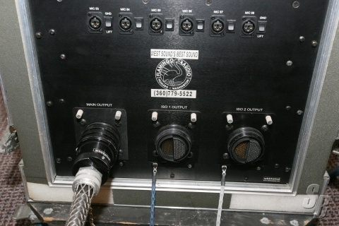 OUTPUT SNAKE A: 250’ 58 CHANNEL FLEX SNAKE TERMINATED MASS TO MASS. THIS 250’ SNAKE CONNECTS TO A 58 CHANNEL DOGHOUSE BOX THAT FANS OUT TO 8 FEET LONG 58 CHANNEL XLR MALES WRAPPED IN SNAKESKIN. CHANNEL 43 ISN’T WORKING. IT’S EITHER A PROBLEM IN THE DOGHOUSE BOX OR 250’ SNAKE. WE’VE TESTED IT, AND IT IS NOT A TRANSFORMER PROBLEM.