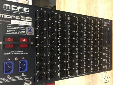 FEATURES: THE MIDAS DL251 IS A 5U FIXED-CONFIGURATION I/O UNIT WITH 48 MIC/LINE INPUTS AND 16 MIC/LINE OUTPUTS. LIMITED TO ANALOGUE CONNECTIONS, THE DL251 FIVES YOU A COST-EFFECTIVE SOLUTION IF YOU DON'T NEED THE FLEXIBILITY OF MIDAS MODULAR I/O HARDWARE. YOU GET MIDI IN, OUT AND THRU - PLUS ONE ETHERNET CONTROL - STANDARD. THREE AES50 PORTS HANDLE THE (N+1) REDUNDANT DIGITAL AUDIO INTERFACE. THE DL251 CAN BE SWITCHED BETWEEN 96KHZ AND 48KHZ FROM THE FRONT PANEL. A REAR-PANEL "MUTE ALL OUTPUTS" BUTTON MAKES FOR EASY ON STAGE RE-PATCHING. THE UNIT IS ALSO EQUIPPED WITH DUAL REDUNDANT PSUS.