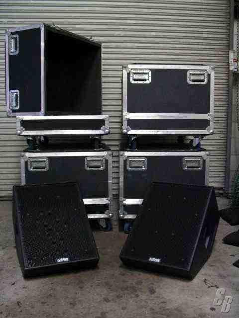 4 CUSTOM ROAD CASES WITH 4" CASTERS. 2 WEDGES PER CASE.