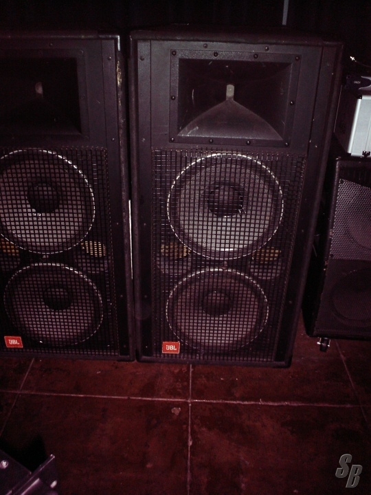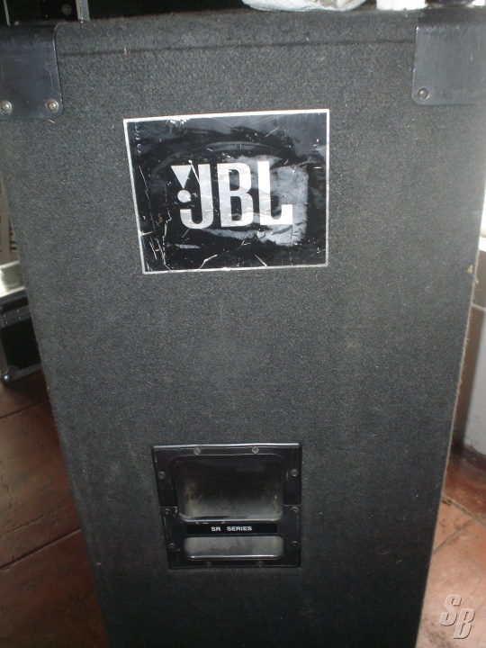 FEATURES: A PAIR OF EXCELLENT CONDITION 1200WATT JBL SR SERIES II DOUBLE 15" WOOFERS AND SINGLE HORN SPEAKERS WITH BLACK METAL GRILLS.