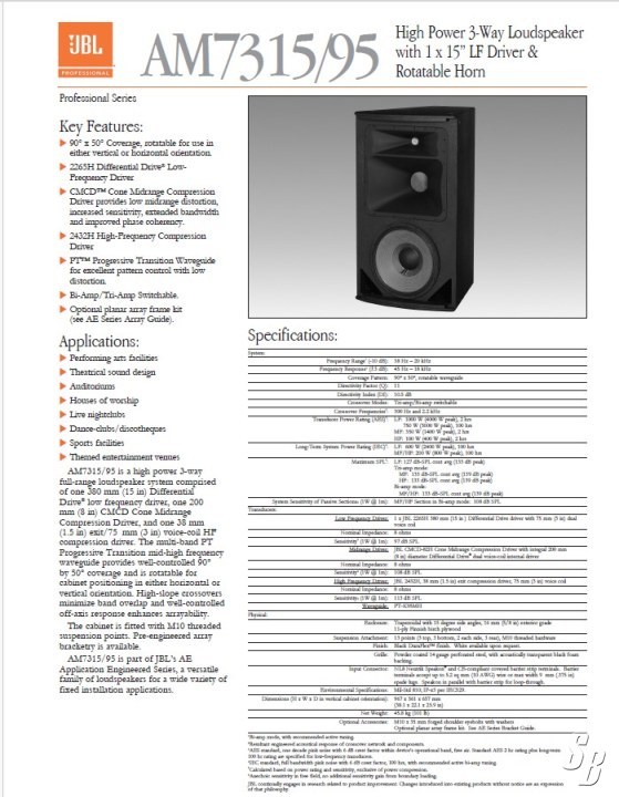 AM7315 SPEAKERS ARE HIGH POWER 3-WAY FULL-RANGE LOUDSPEAKER SYSTEMS COMPRISED OF ONE 380 MM (15 IN) DIFFERENTIAL DRIVE® LOW FREQUENCY DRIVER, ONE 200 MM (8 IN) CMCD CONE MIDRANGE COMPRESSION DRIVER, AND ONE 38 MM (1.5 IN) EXIT/75 MM (3 IN) VOICE-COIL HF COMPRESSION DRIVER.