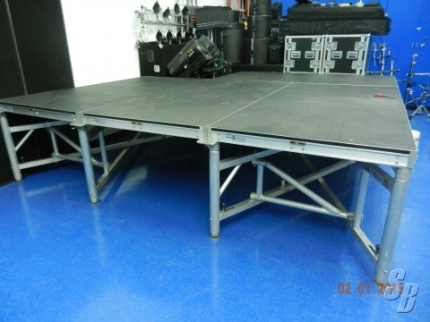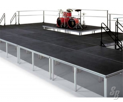 FEATURES: STAGING DIMENSIONS STAGE SET-UP: TWENTY-TWO 4'X 8' FLOOR PANELS WITH POLYVINYL SLIP PROOF AND WATER RESISTANT SURFACE, 704 SQUARE FEET TOTAL SURFACE AREA. CONFIGURE IN ANY ARRANGEMENT YOU LIKE SUCH AS 16X44, 20X32, 24X24, OR OTHER, AS WELL AS STAGGER THE HEIGHT SUCH AS FOR A DRUM RISER. SEE PICTURE EXAMPLES. STAGE IS SUPPORTED BY 14 STAGING DIMENSIONS WUNDER STRUCTURES THAT ADJUST FROM 36 TO 56 INCHES IN HEIGHT. EACH WUNDER STRUCTURE HAS ADJUSTABLE LEVELING PADS AND PROVIDES A SOLID STAGE FOUNDATION UNPARALLELED IN THE INDUSTRY. STAGING DIMENSIONS 4X8 PANELS AND WUNDER STRUCTURES ARE COMPLETELY COMPATIBLE WITH OTHER BRANDS OF STAGING. FLOOR PANELS CAN ALSO USE STANDARD ALUMINUM TUBE FOR LEGS.