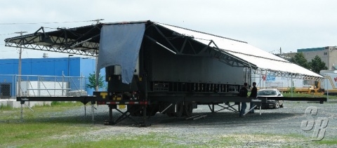 THERE HAVE BEEN A FEW MODIFICATIONS OVER THE YEARS. THE FIRST WAS EXTRA I-BEAMS WERE INSTALLED TO ALLOW US TO HANG DIFFERENT TYPES OF PA'S. THE FLOOR WAS ALSO REINFORCED TO ALLOW MORE WEIGHT TO BE HUNG OFF THE FRONT POSTS. THE FINAL MODIFICATION WAS MADE TO INCREASE THE SIDE PLATFORM, TO A 16' X 20' AREA.
