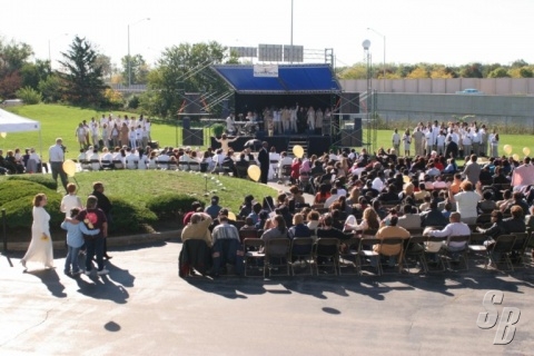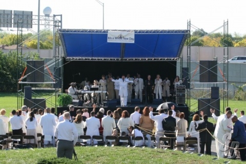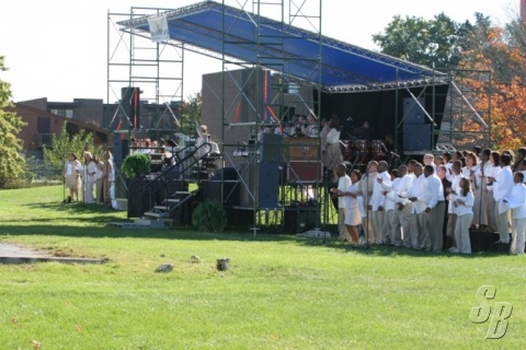 IT TOOK 6 GUYS (2 EXPERIENCED AND 4 W/NONE) TWO AND A HALF HOURS TO SET UP COMPLETE STAGE ON UNEVEN GROUND, W/ROOF.